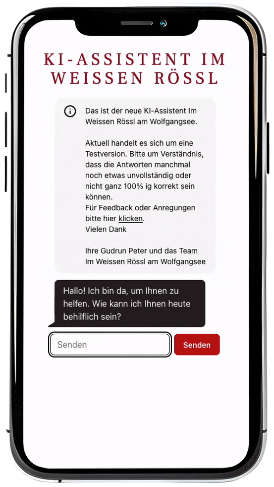 Probieren Sie den KI-Assistenten direkt aus beim Romantik Hotel Im Weissen Rössl.Demo